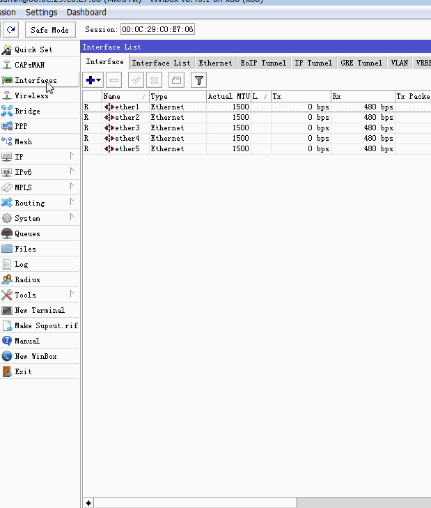 登上来之后我们看到ether5发送和接收都是有流量的,说明我们现在接网线调试的接口为ether5,可以使用这种方法来识别接口。
