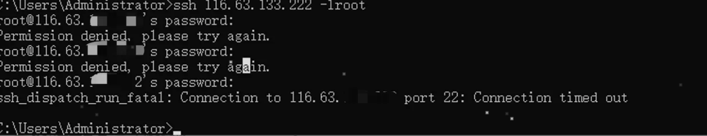 尝试错误登录服务器5次,发现再也登录不上了,服务器返回连接超时。