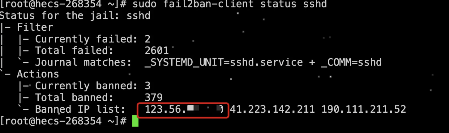 sudo fail2ban-client status sshd #查看sshd的详细状态