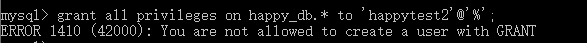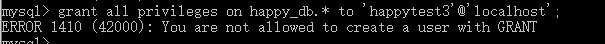 给新用户授权,这里授予的权限是只能操作一个数据库(数据库名为:happy_db,把数据库名变成 *.* 就是给所有数据库的权限)(如果root用户只允许localhost登录,而这里授权的时候又给用户授予不管任何地址都可以登录的能力,则会报无权限的错。此时需要把root用户也改成‘%’的登录限制才行,也就是说,授权者的可登录源ip范围应该 ≥ 被授权者的可登录源ip范围)