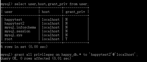 grant all privileges on happy_db.* to 'happytest'@'localhost';