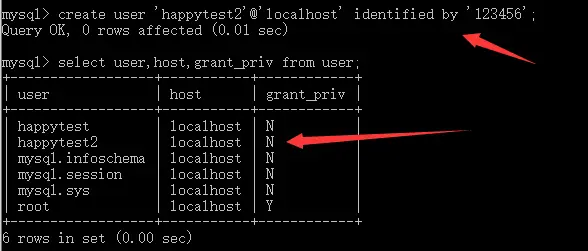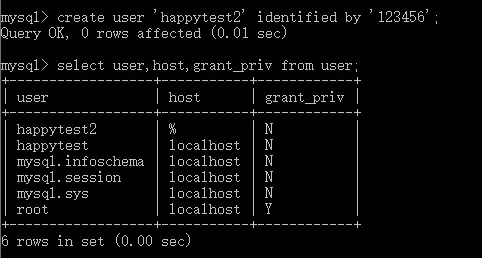 create user 'happytest'@'localhost' identified by '123456';
