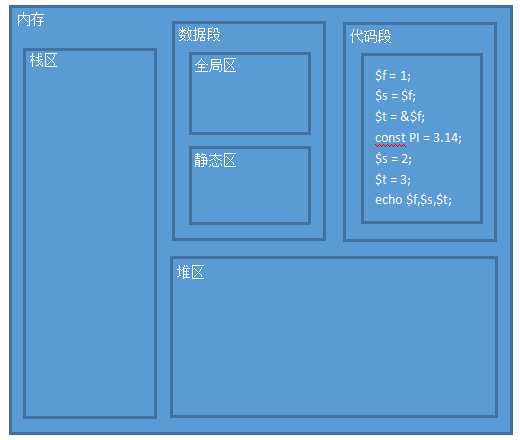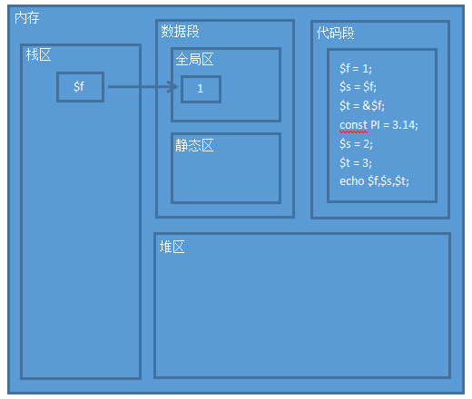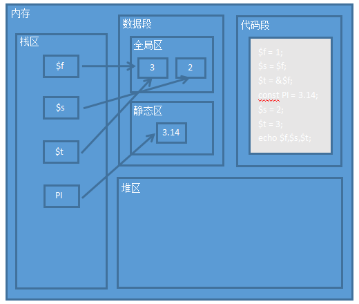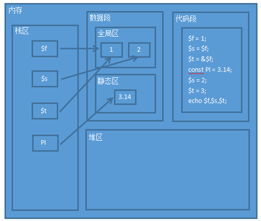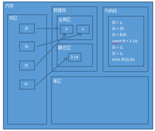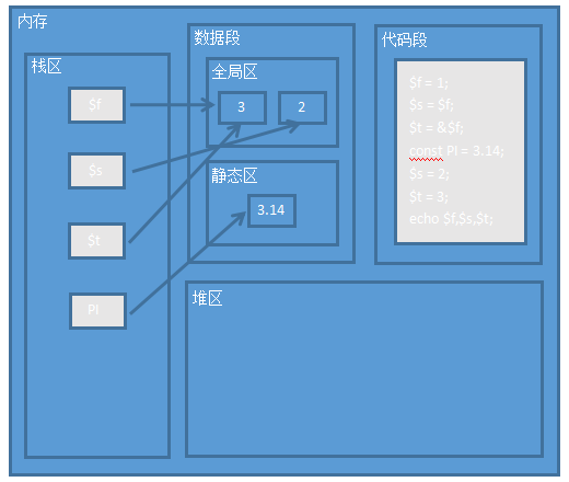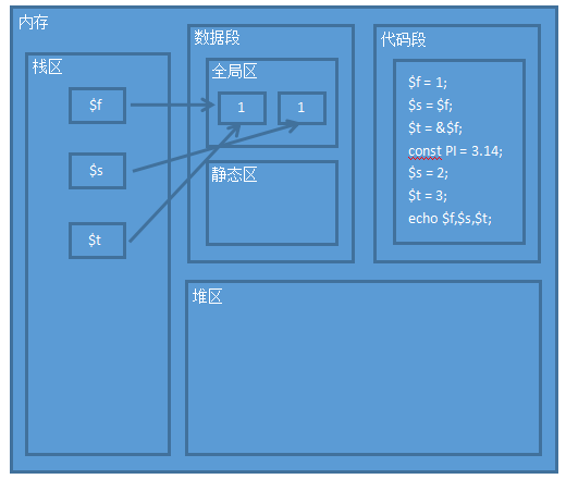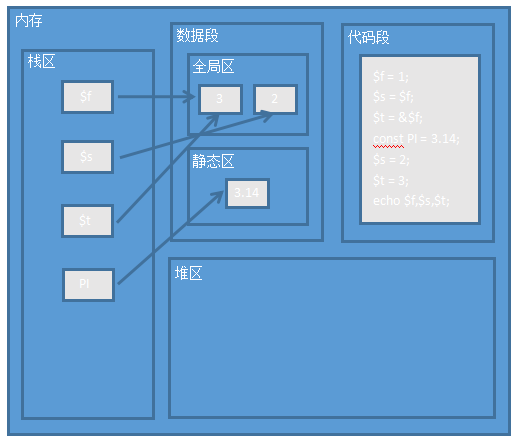 // 定义变量 $f = 1; $s = $f; // 值传递 $t = &$f; // 引用传递 const PI = 3.14; // 修改变量 $s = 2; $t = 3; // 输出 echo $f,$s,$t;