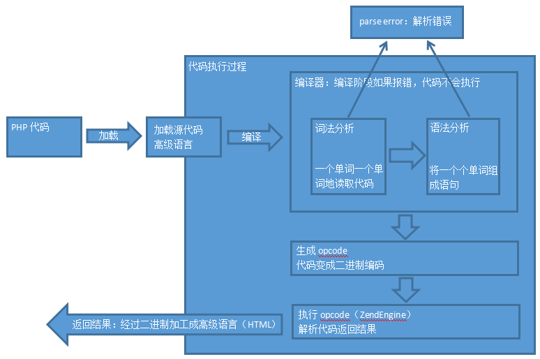 PHP是一种高级语言(接近自然语言),所以不可能被计算机直接解析(计算机只能识别机器码(二进制))。