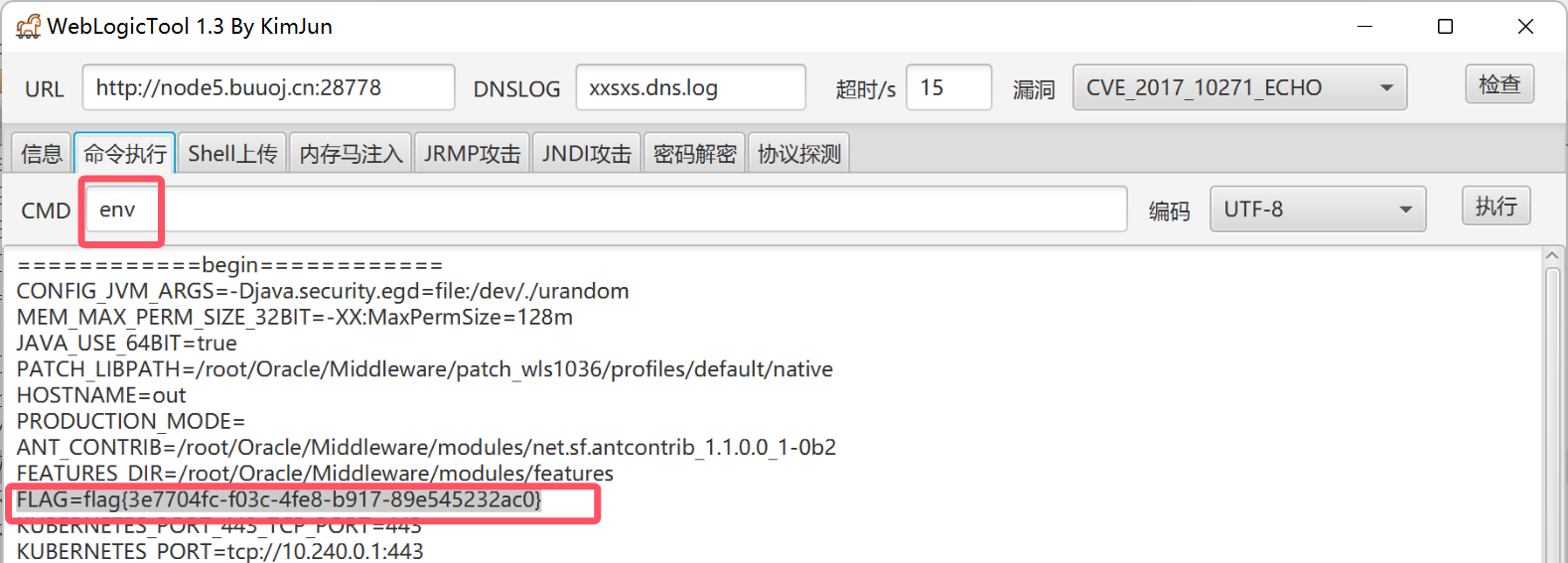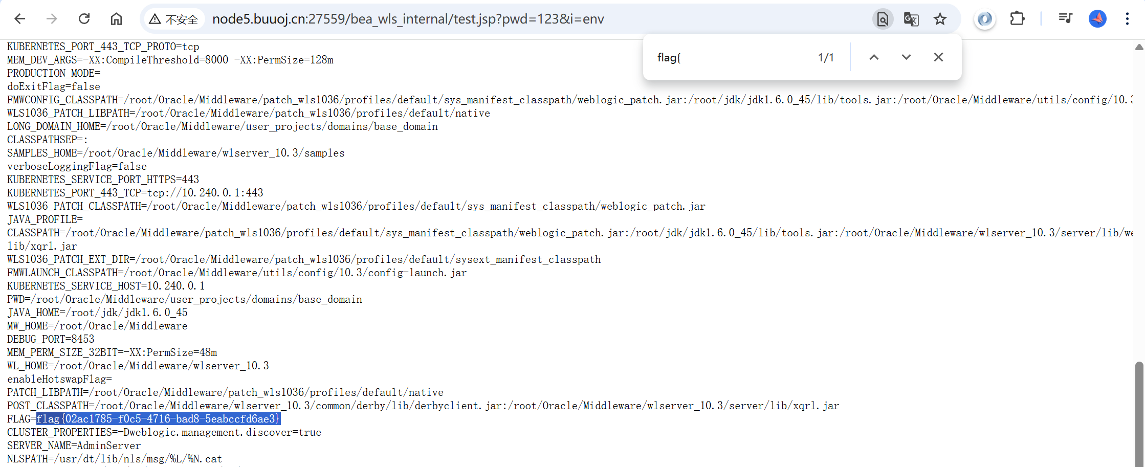 4、访问 http://node5.buuoj.cn:27559/bea_wls_internal/test.jsp?pwd=123&i=env ,打印环境变量,找到flag。