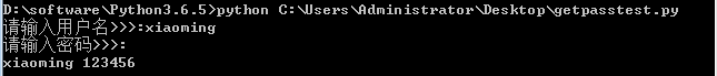 import getpass username = input("请输入用户名>>>:").strip() password = getpass.getpass("请输入密码>>>:").strip() ####使输入密码不显示,此模块在pycharm中无法使用 print(username,password)