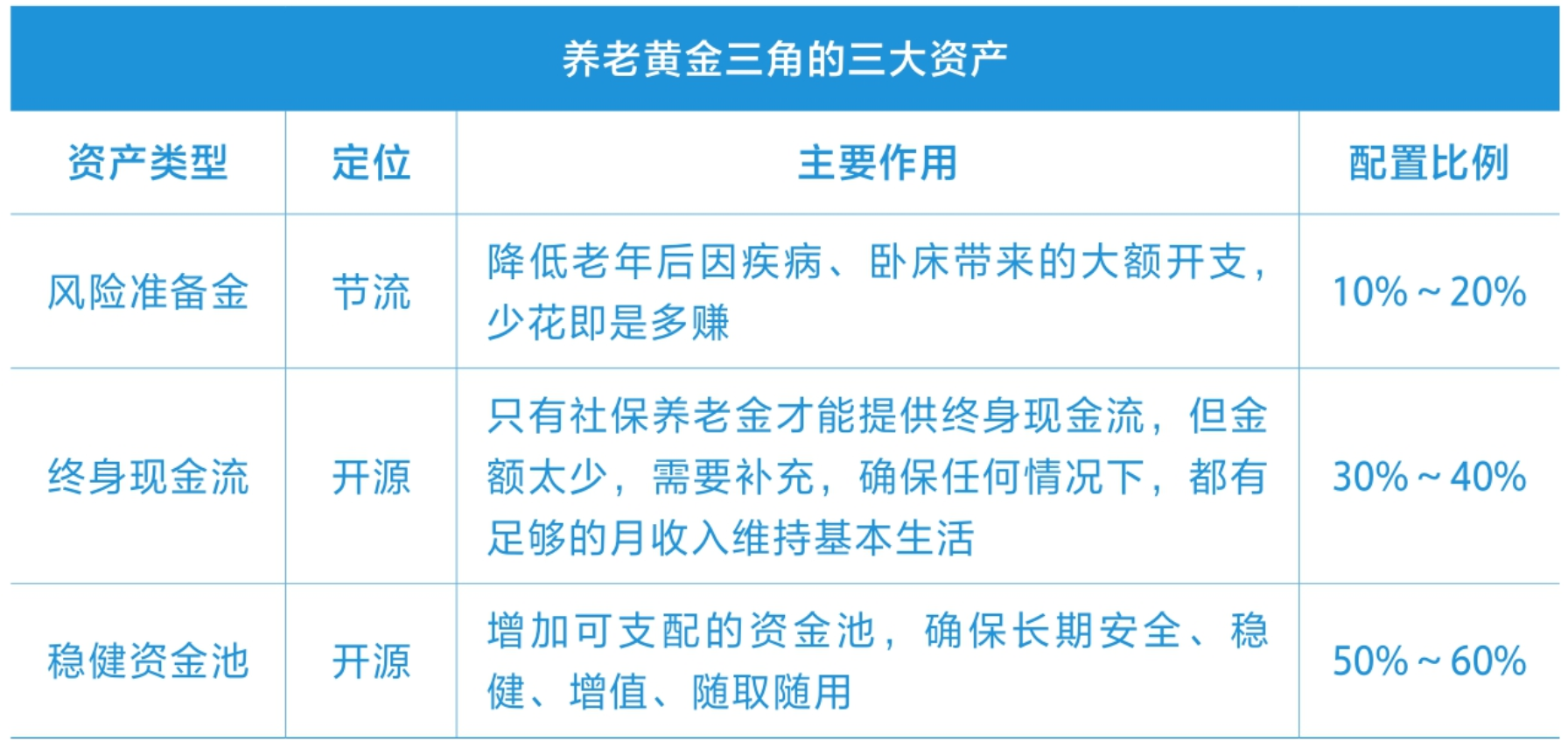 - 第三,在规划个人养老金时,一定要按照黄金三角的三个层次来做。(先兜好风险,再保证现金流,最后争取更多的自由可支配资金。)