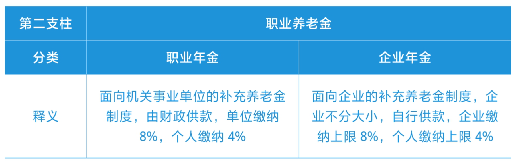 - 第二支柱养老金,也叫“打工人”养老金。第二支柱主要有两种:一种是职业年金,主要面向机关事业单位;一种是企业年金,主要面向各类公司和企业。
