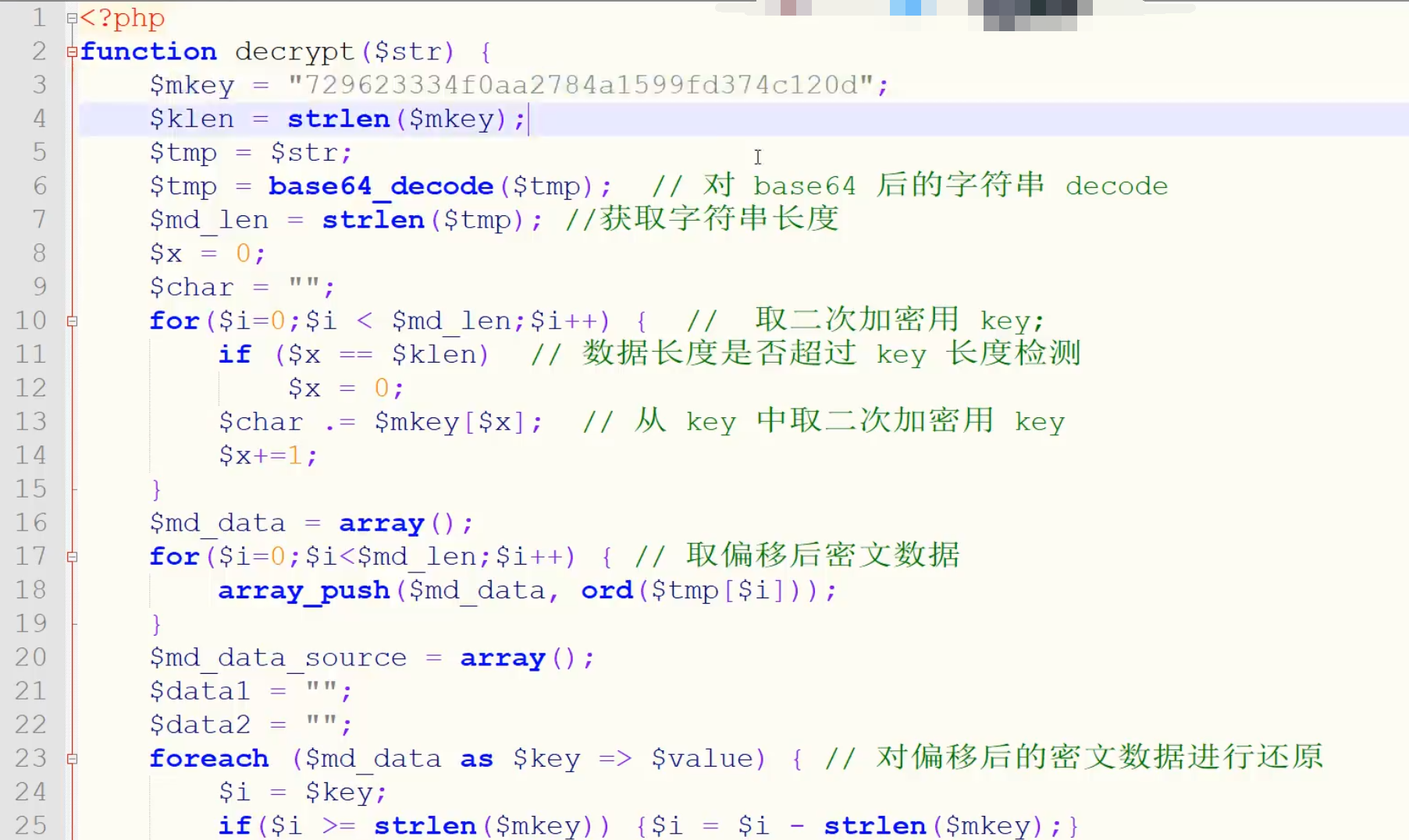 大概读了一下是用一个MD5后ISCC为密钥,对密钥重复扩展到待加密数据的长度,然后对它们的每个字节进行了密钥与明文的acill的数字值相加后对128取余,再恢复成字符串,然后进行base64编码,题目中给出的一串字符串明显用了base64编码,所以我们反向推出data