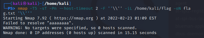 nmap -T5 -sT -Pn --host-timeout 2 -F ''\\'' -iL /flag -oN flag.txt '\\'''