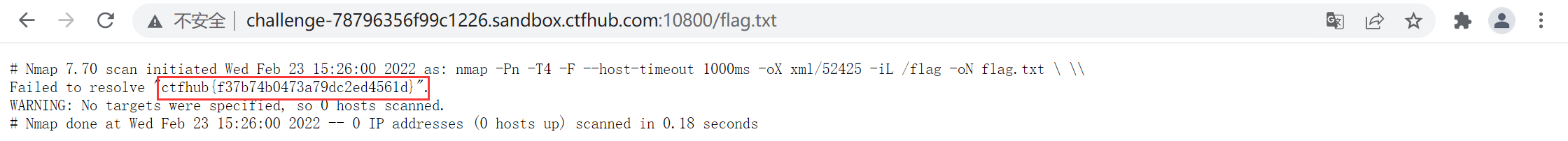 执行payload,将根目录下的flag文件内容作为扫描目标,并将扫描结果重定向到flag.txt文件中