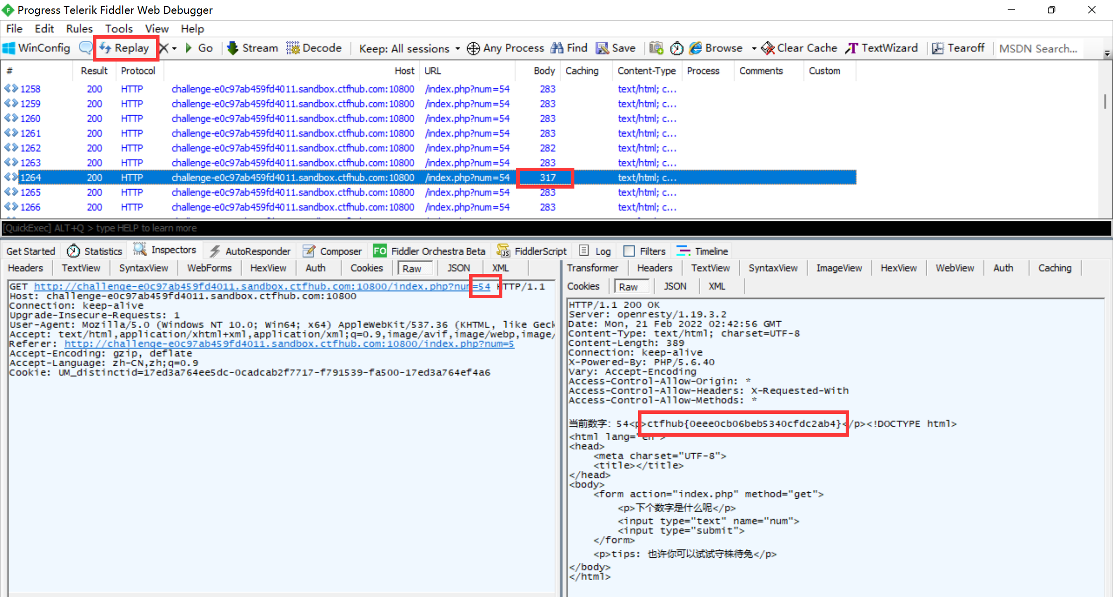 我们输入一个两位数,比如54,抓包,一直重放请求,查看响应长度,会发现有一个响应长度明显与其他的不一致,查看响应,得到flag。