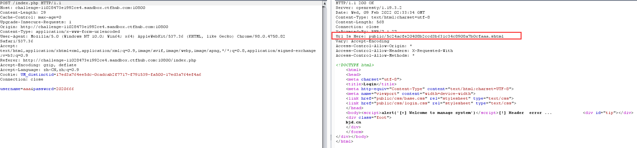 <?php ob_start(); function get_hash(){ $chars = 'ABCDEFGHIJKLMNOPQRSTUVWXYZabcdefghijklmnopqrstuvwxyz0123456789!@#$%^&*()+-'; $random = $chars[mt_rand(0,73)].$chars[mt_rand(0,73)].$chars[mt_rand(0,73)].$chars[mt_rand(0,73)].$chars[mt_rand(0,73)];//Random 5 times $content = uniqid().$random; return sha1($content); } header("Content-Type: text/html;charset=utf-8"); *** if(isset($_POST['username']) and $_POST['username'] != '' ) { $admin = '6d0bc1'; if ( $admin == substr(md5($_POST['password']),0,6)) { echo "<script>alert('[+] Welcome to manage system')</script>"; $file_shtml = "public/".get_hash().".shtml"; $shtml = fopen($file_shtml, "w") or die("Unable to open file!"); $text = ' *** *** <h1>Hello,'.$_POST['username'].'</h1> *** ***'; fwrite($shtml,$text); fclose($shtml); *** echo "[!] Header error ..."; } else { echo "<script>alert('[!] Failed')</script>"; }else { *** } *** ?>