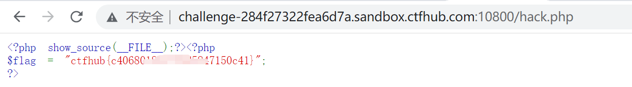 利用方式1:利用show_source高亮代码。审计源码时注意到,源码已经将flag.php内容写入hack.php,这样只需要高亮自己就可以查看源码得到flag了。(由于写入的是源码,因此我们直接访问hack.php无法看到。)