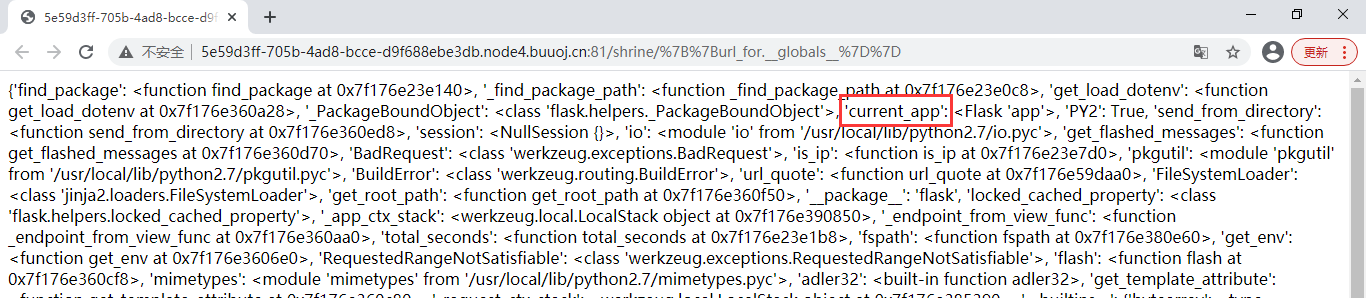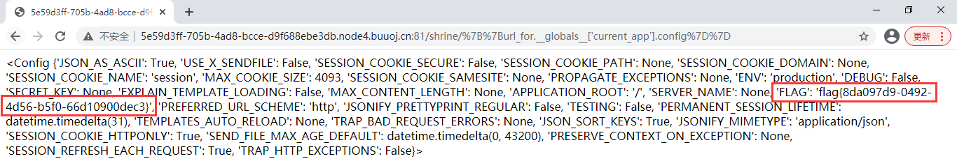 current_app意思应该是当前app,那我们就看当前app下的config:/shrine/{{url_for.__globals__[‘current_app’].config}},成功拿到flag。