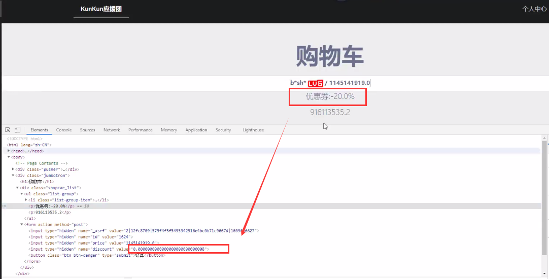 <5>发现购买时有一个优惠券,尝试在前端修改优惠券折扣,点击结算,提示“该页面只允许admin访问”。