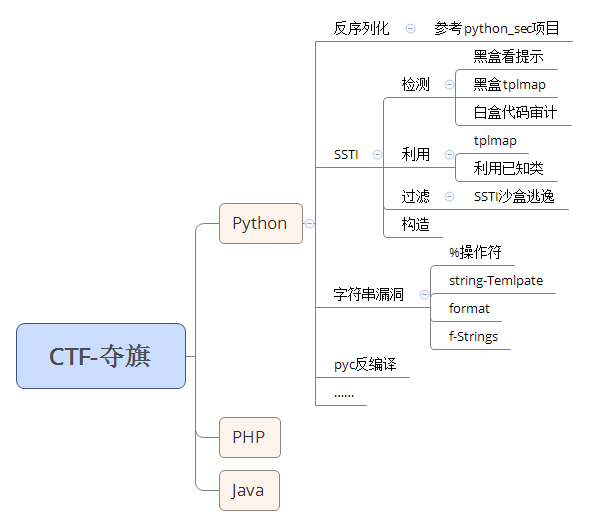 在大量的比赛真题复现中,将涉及到渗透测试的题库进行了语言区分,主要以 Python, PHP,Java为主,本章节将各个语言的常考点进行真题复现讲解。