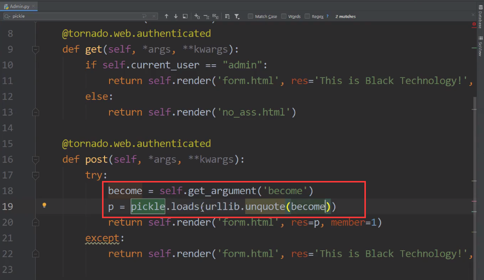 <10>使用idea工具打开源码,全局搜索漏洞关键字。发现反序列化关键字pickle,猜测这里有反序列化漏洞。