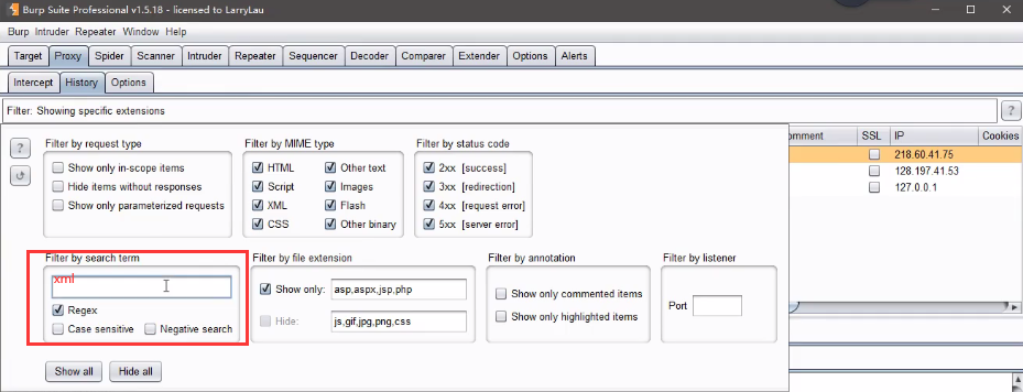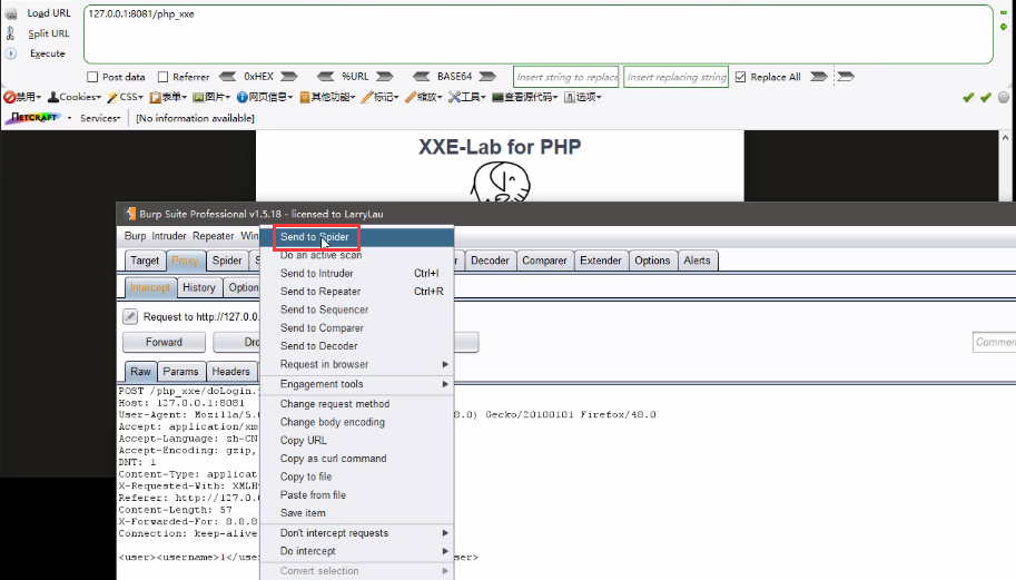 以xxe-lab靶场登录框为例,使用burp抓包时,可以右击send to Spider自动爬行网站,所有的网站数据包会在Proxy-History模块显示。