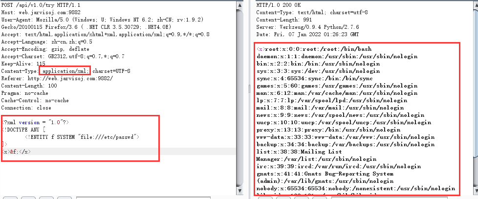 更改请求数据格式为:application/xml,使用以下脚本,成功读取服务器文件passwd内容。