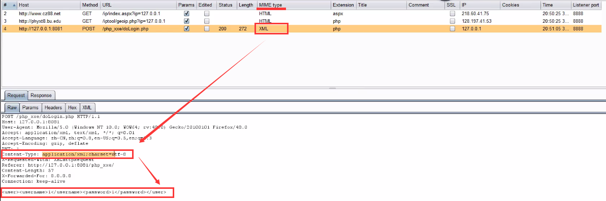 也可以查看MIME type类型是否为XML,MIME type类型为XML对应Content-Type: text/xml或Content-Type: application/xml,对应内容形式如下:<user><username>2</username><password>2</password></user>