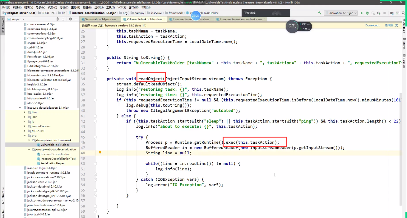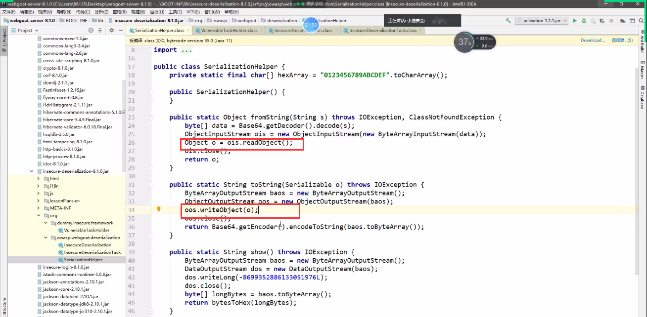使用jd-gui工具或者IDEA工具(推荐)打开webgoat-server-8.2.2.jar,分析源代码。