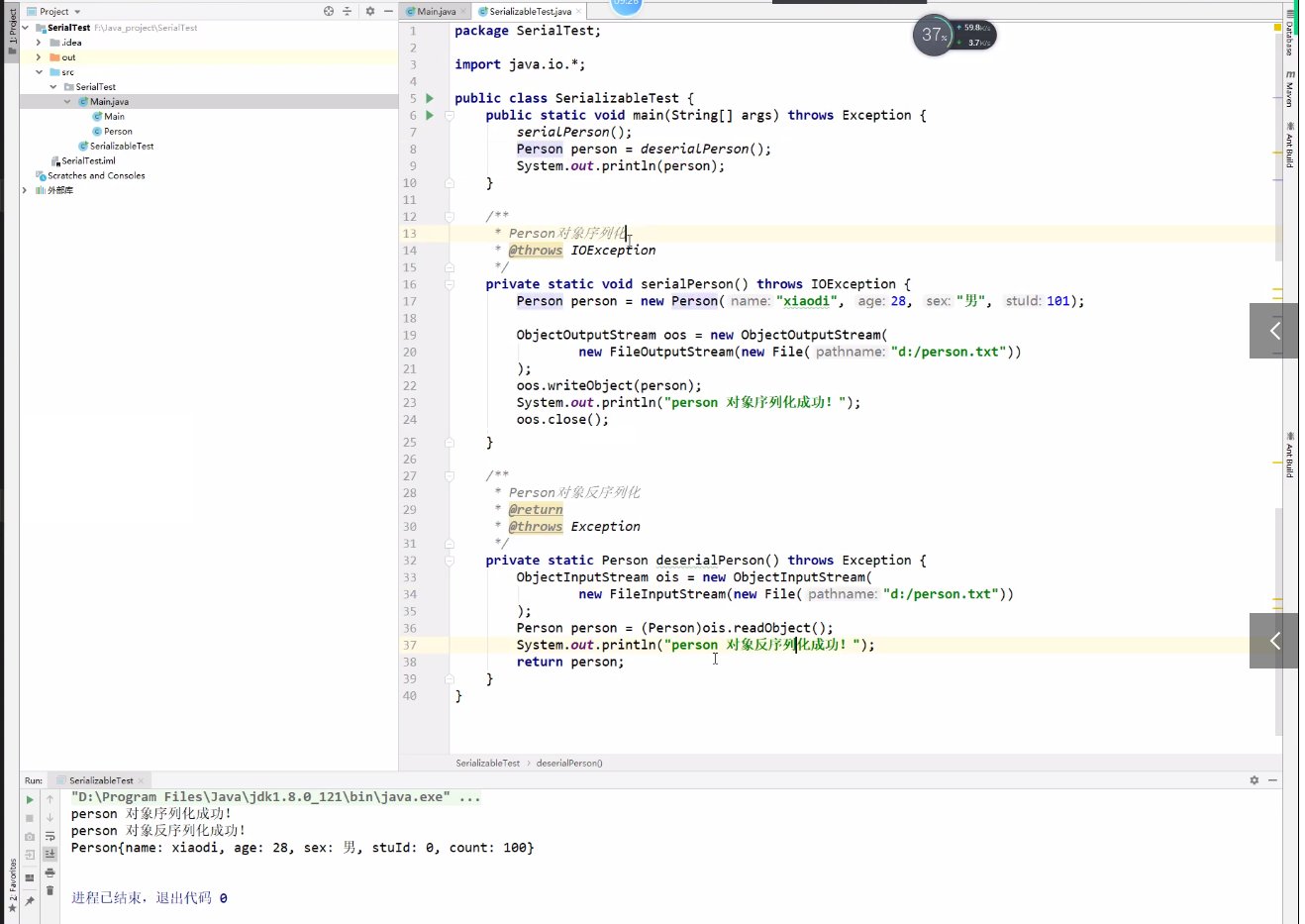 序列化过程:使用writeobject方法,将Person对象数据转化为txt乱码数据;
