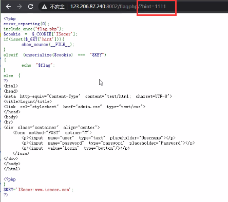 这个登录框没啥用,根据提示在url后面加?hint=111,系统返回源代码
