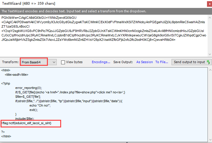 <4>还可以使用php://filter协议,读取文件内容后,到本地base64解码,拿到flag。