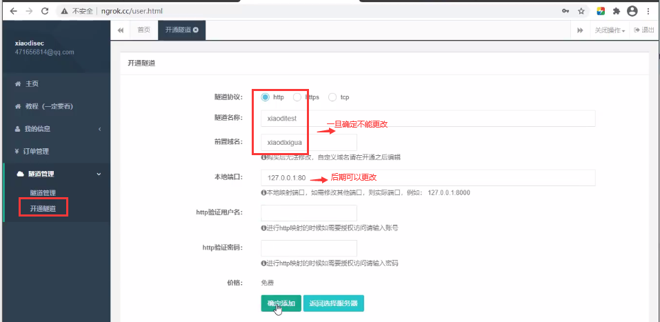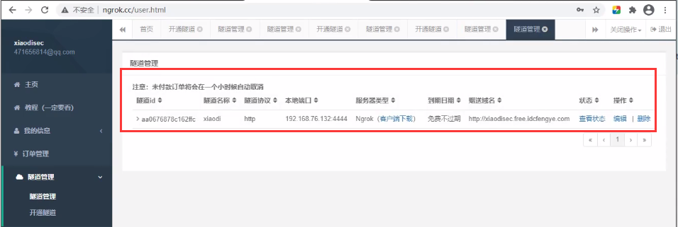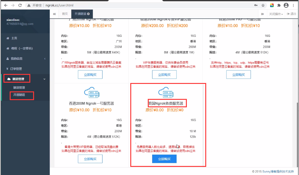 <4>开通隧道(仅做测试用,使用免费的即可,免费的不稳定容易断,实战中建议使用收费版)