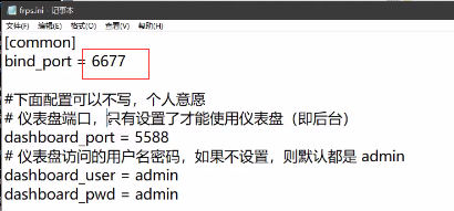 服务器修改配置文件frps.ini: [common] bind_port = 6677 启动服务端: ./frps -c ./frps.ini