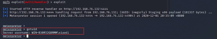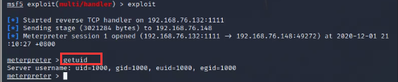 <11>此时kali上接收到会话,getuid可以查看会话权限。