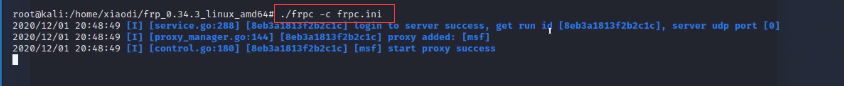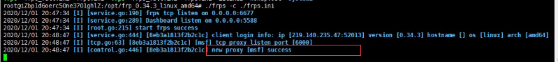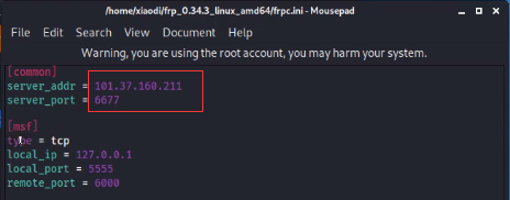 [common] server_addr = 你的云主机ip server_port = 6677 #frpc工作端口,必须和上面frps保持一致 [msf] type = tcp local_ip = 127.0.0.1 local_port = 5555 #转发给本机的5555 remote_port = 6000 #服务端用6000端口转发给本机