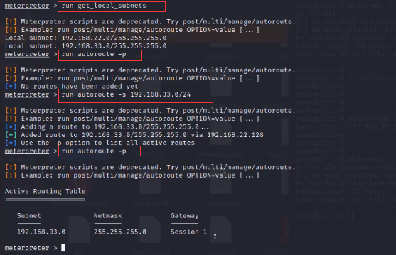 获取网络接口:run get_local_subnets 查看路由地址:run autoroute -p 添加路由地址:run autoroute -s 192.168.33.0/24