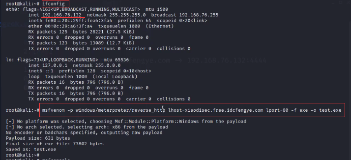 <12>配置并监听(一旦xiaodisec.free.idcfengye.com有流量,就发给本地192.168.76.132:4444)