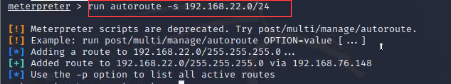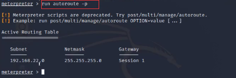 接着,我们就要添加路由地址:run autoroute -s 192.168.22.0/24