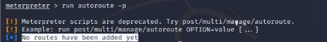 然后,查看路由地址:run autoroute -p ,发现当前的路由地址是空的