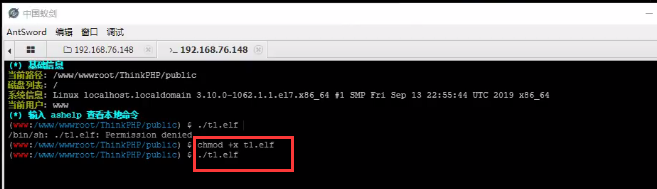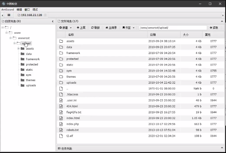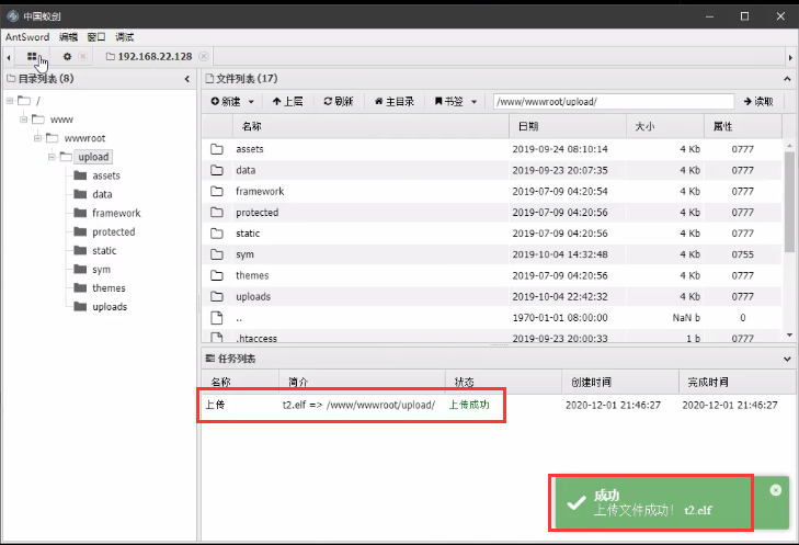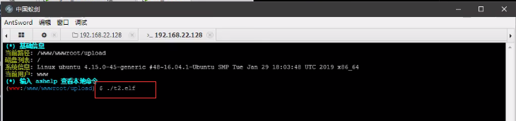 <10>将生成的后门通过蚁剑webshell上传到target1主机,执行后门。
