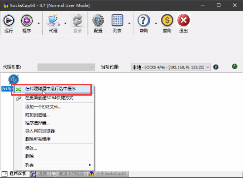 最后,右击添加的程序,选择”在代理隧道中运行选中程序”。